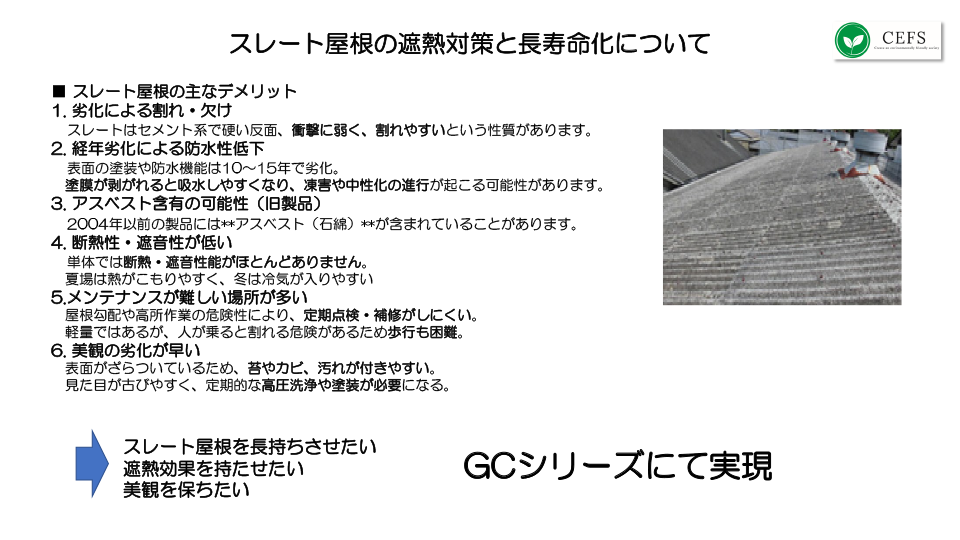 GCシリーズを用いた補強・遮熱施工により、従来の課題である割れ・劣化・断熱性不足などを解消。