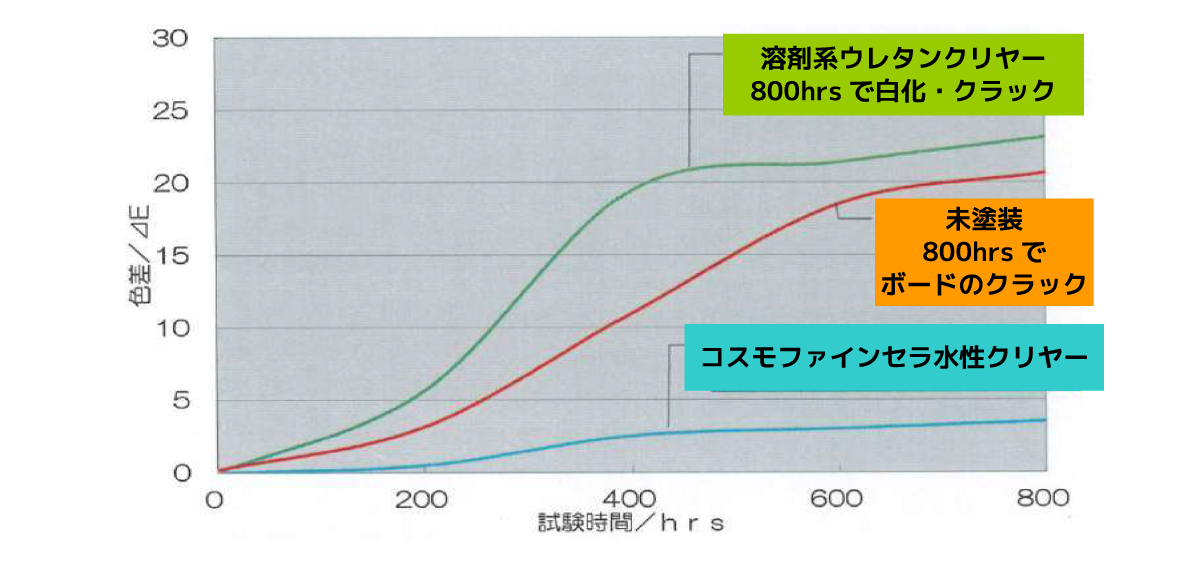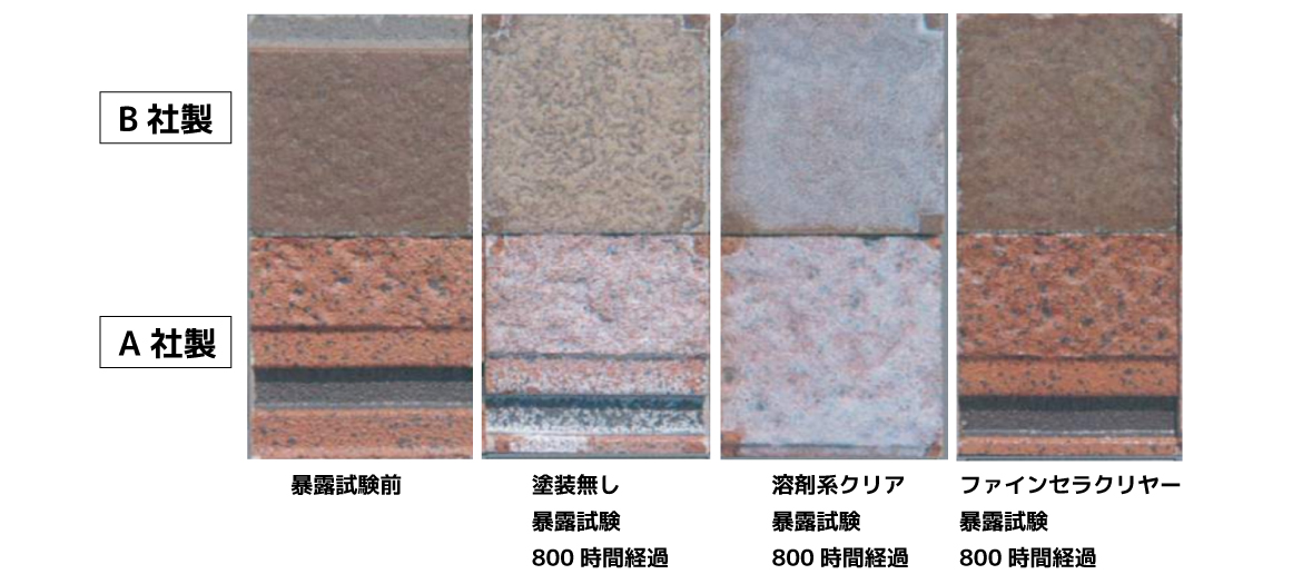 S-UV試験(紫外線(UV)と湿気(結露)を交互に与えるサイクル試験)を800時間(15年相当)を行った結果、溶剤系クリアは劣化により白化が進んだが、ファインセラ水性クリヤーはまったく白化が進んでいない。